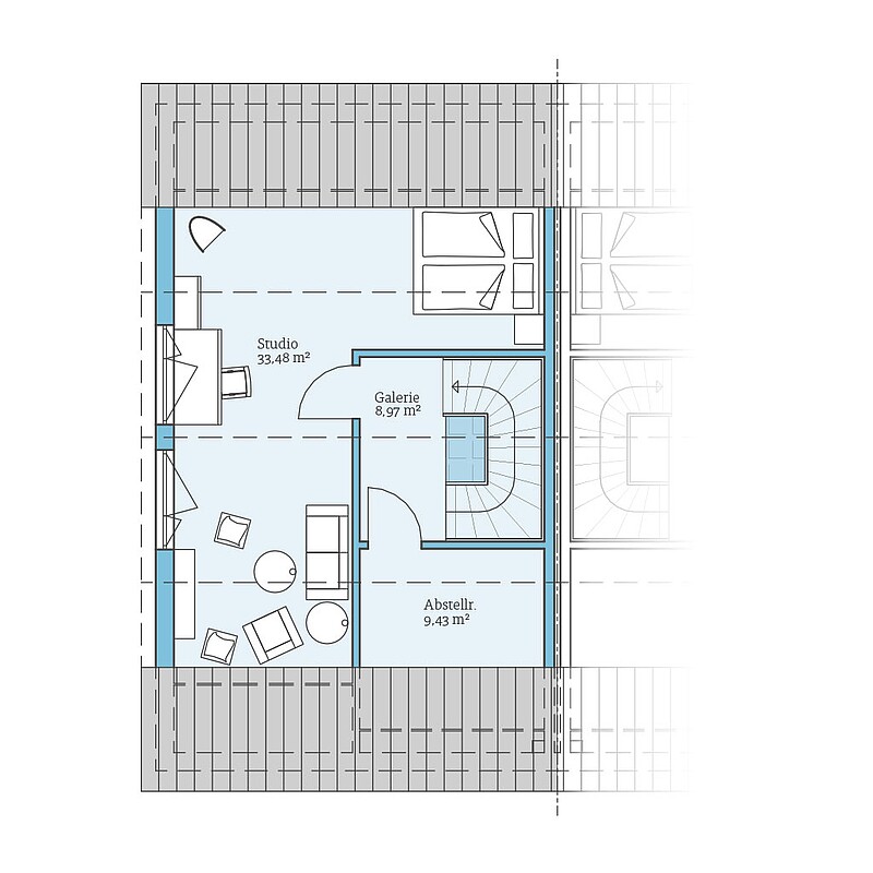 Zwei helle Vollgeschosse und ein ca. 33 m² großes Studio im Dachgeschoss schaffen vielseitige Nutzungsmöglichkeiten – z. B. als Home Office, Gäste- oder Hobbybereich. Ein zusätzlicher Abstellraum sowie ein optionales Duschbad im Erdgeschoss erhöhen den Wohnkomfort.