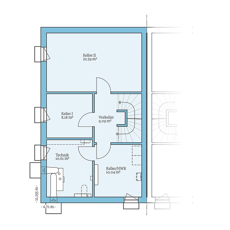 - Mit zwei Kellerräumen, Vorkeller, Technikraum sowie einem Hauswirtschafts- oder Kellerraum